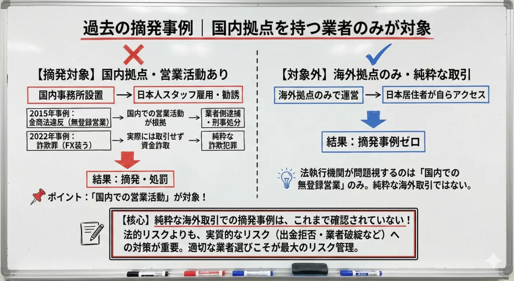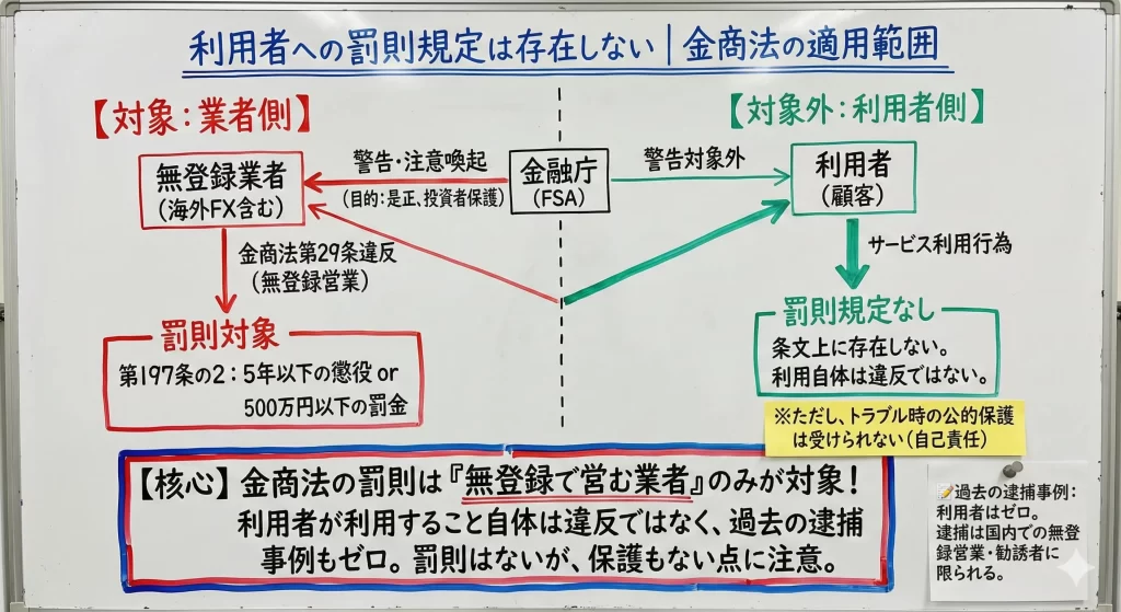 実際の法執行においても、金融庁や証券取引等監視委員会が摘発するのは無登録営業を行う業者側であり、その利用者を追及した事例は存在しません。