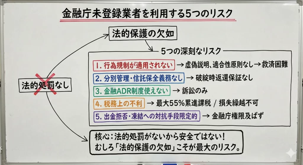 💡 つまり、利用者側が罰せられるケースは実質的にないということですね。違法性はあくまで業者の無登録営業行為にあります。