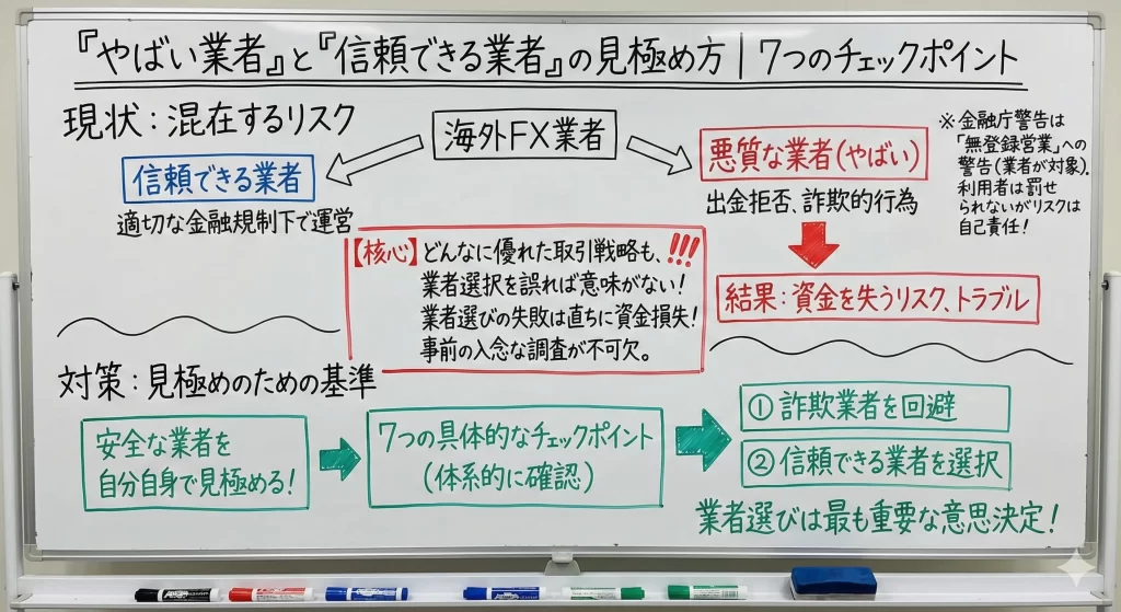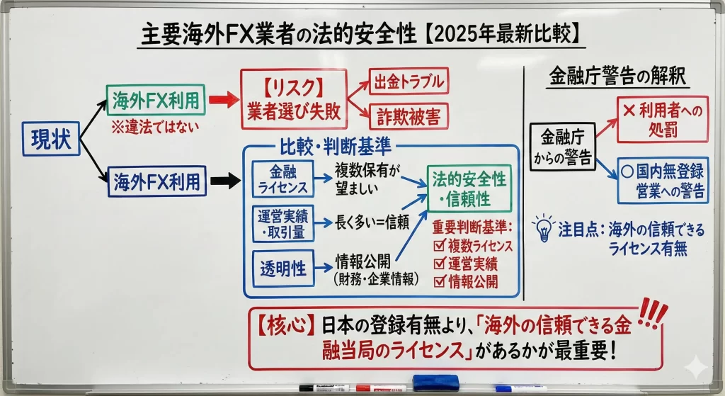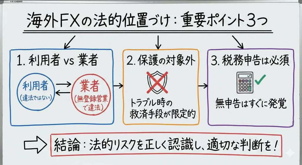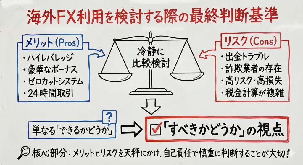海外FXの利用判断は、単なる「できるかどうか」ではなく「すべきかどうか」の視点で慎重に検討することが大切です。