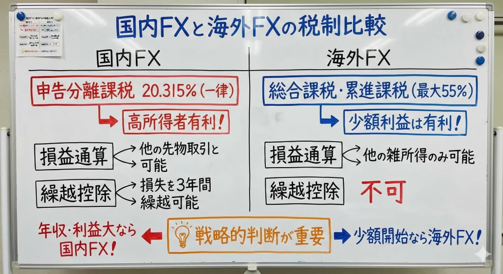 総合課税では所得額に応じて15%から最大45%の所得税(住民税10%を加えると最大55%)が課されるため、国内FXの申告分離課税(一律20.315%)と比較して税負担が大きくなる可能性があります。