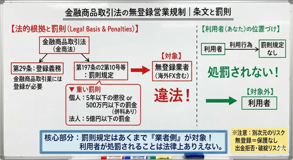海外FX業者に対する金融庁の警告の法的根拠は、金融商品取引法第29条の登録義務と、第197条の2第10号の罰則規定にあります。