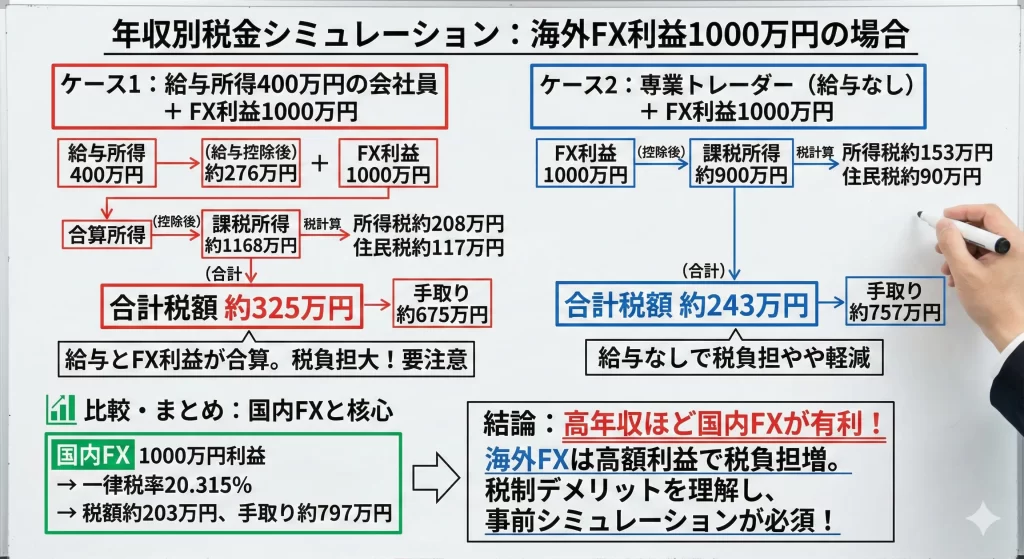 給与所得が500万円あり海外FXで200万円の利益を得た場合、合計700万円に対する税率が適用されるため、海外FXの利益に対して約33%(所得税23%+住民税10%)の税金がかかります。
