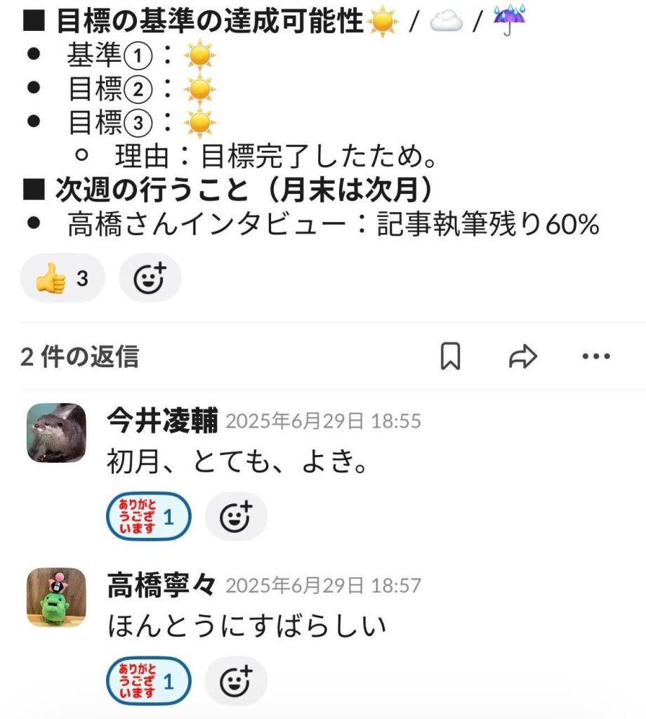 メンバーの方に励ましてもらったりなど助けられたおかげもあり、8月末までに目標を達成することができました!