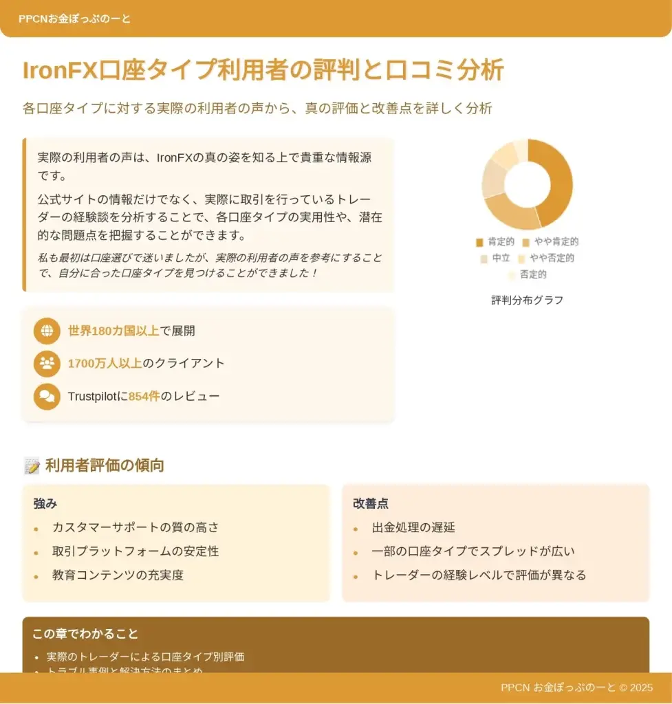 利用者の評判を分析すると、IronFXの強みとして挙げられるのは、カスタマーサポートの質の高さ、取引プラットフォームの安定性、そして教育コンテンツの充実度です。