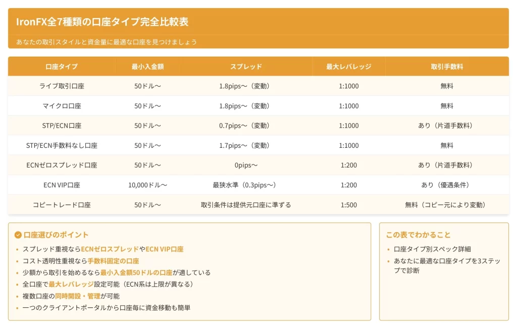 2025年現在、IronFXでは7種類の口座タイプ(ライブ取引口座、マイクロ口座、STP/ECN口座、STP/ECN口座手数料なし口座、ECNゼロスプレッド口座、ECN VIP口座、コピートレード口座)を提供しています。