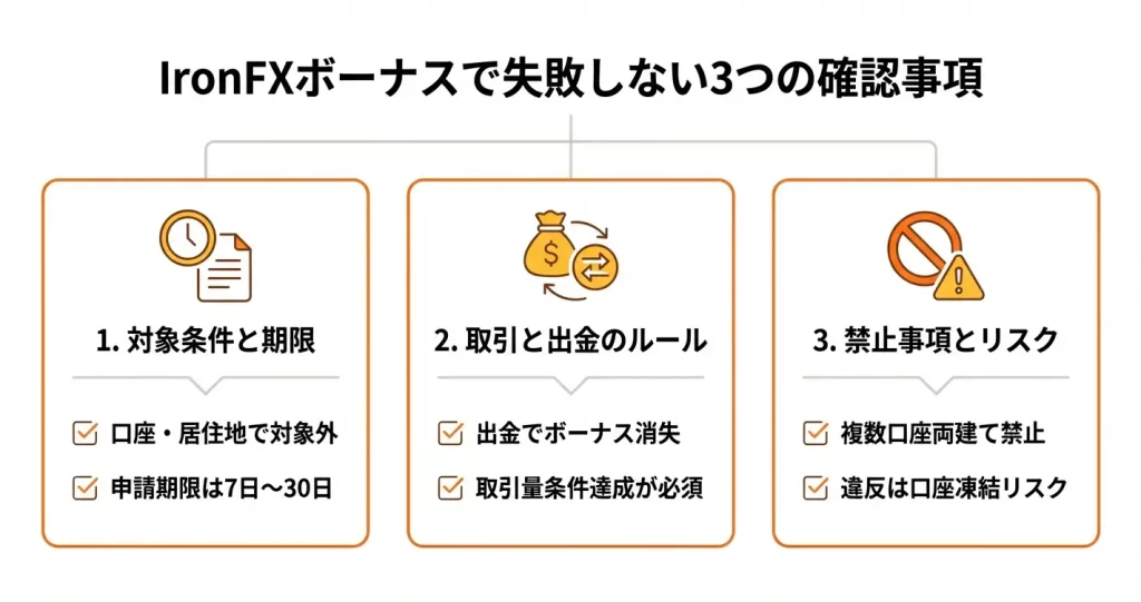 口座開設とボーナス取得のタイミングが分離されている点は、IronFXのボーナス設計における特徴といえます。