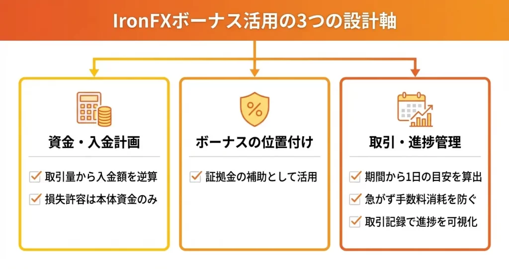 ここでは、初回入金額の設定、リスク管理の視点、出金条件を満たすための取引計画という3つの観点から、IronFXのボーナスを効率的に活用する方法を整理します。いずれも実際の取引開始前に設計しておくことで、計画的な運用が可能になります。