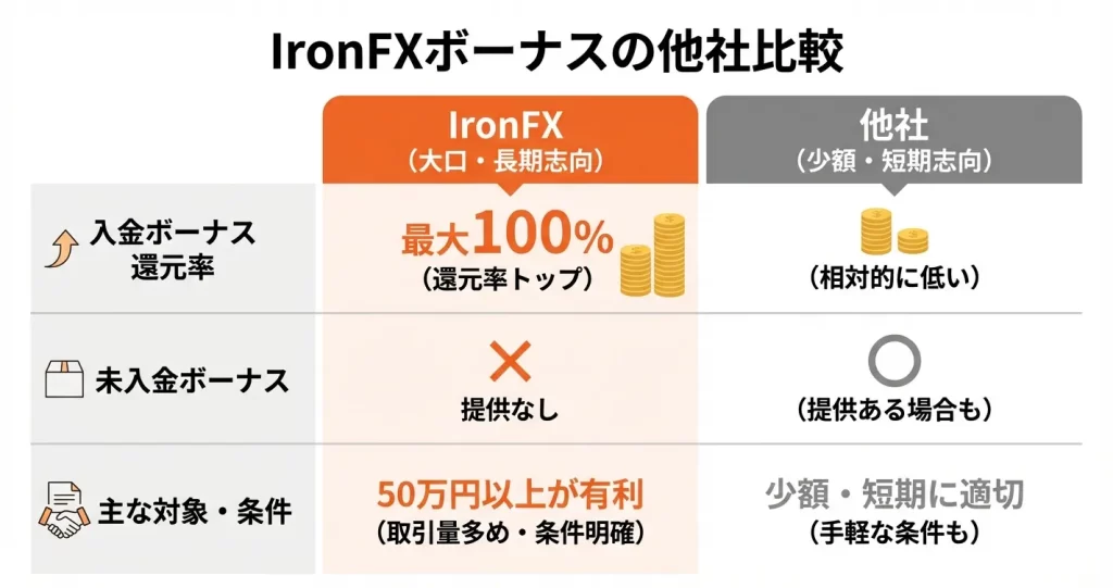IronFXは入金ボーナスの還元率が高い一方で、未入金ボーナスを提供していない点が他社と異なります。