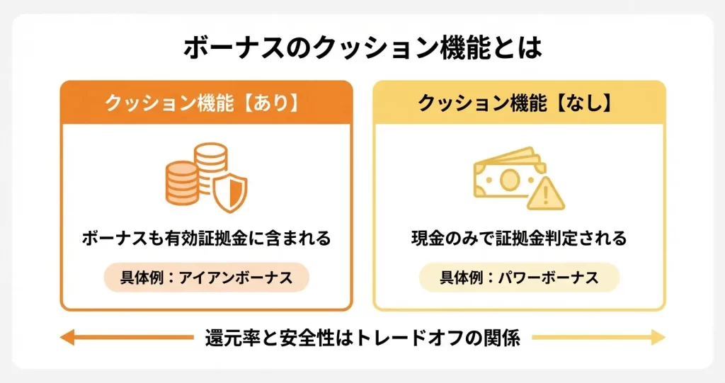クッション機能の有無は、同じボーナス額でも取引戦略によって評価が変わる重要な要素です