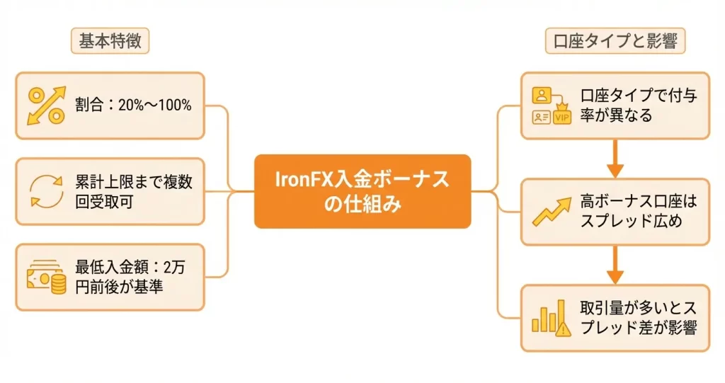 IronFXの入金ボーナスは、入金額に対して一定割合が付与される仕組みですが、割合や上限額は選択する口座タイプによって異なります。
