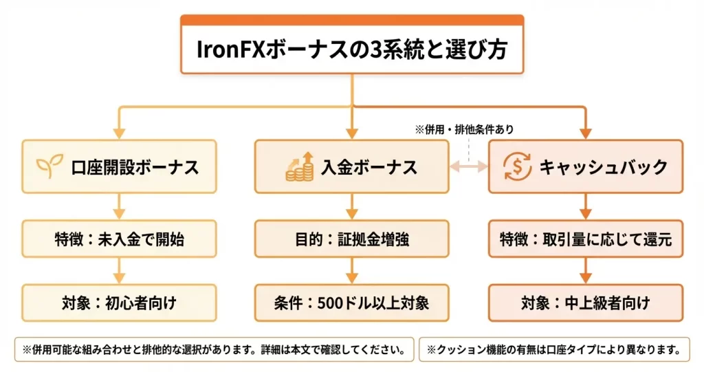 IronFXが公式に提供しているボーナスは、大きく分けて入金ボーナス、口座開設ボーナス、キャッシュバックプログラムの3系統に分類されます。