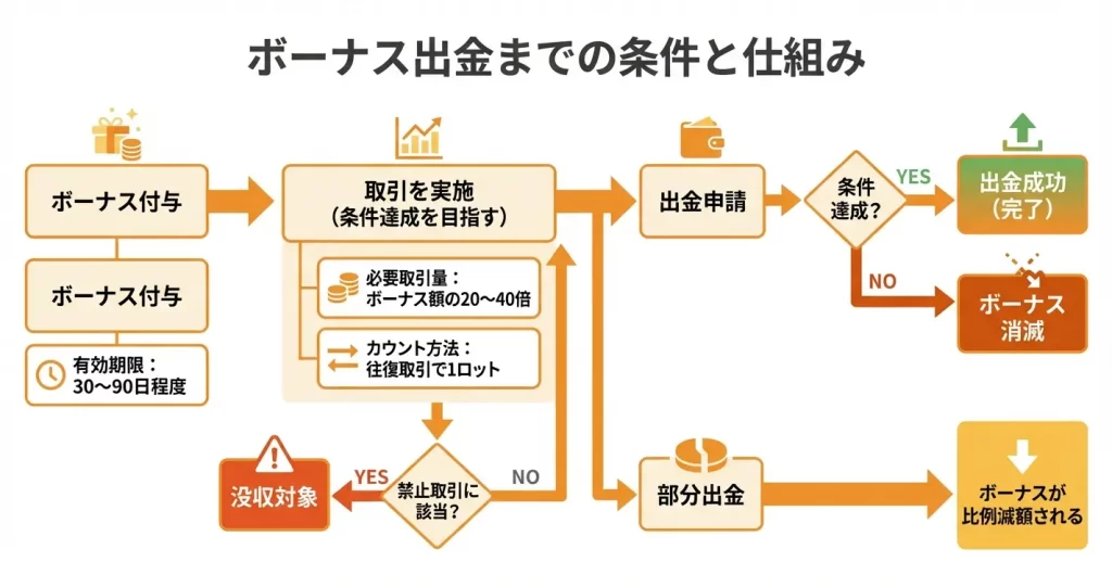 条件を満たさずに出金しようとするとボーナスが消滅する仕組みは、IronFXに限らず業界共通のルールです。