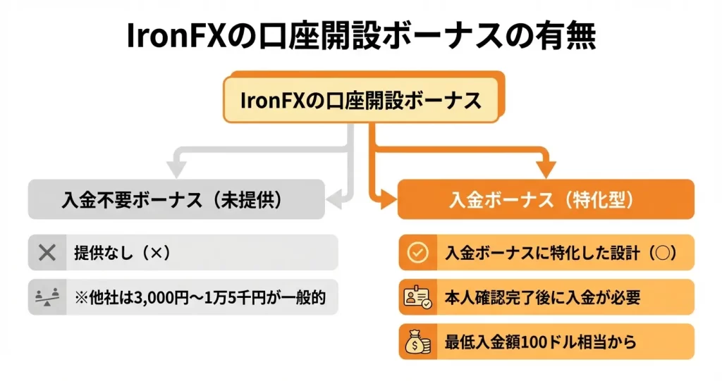 一部の海外FXブローカーでは入金不要で3,000円から15,000円程度の口座開設ボーナスを提供していますが、IronFXはすべてのボーナスが入金と連動する設計です。