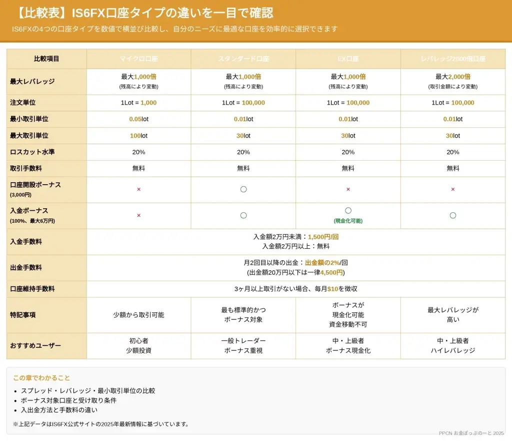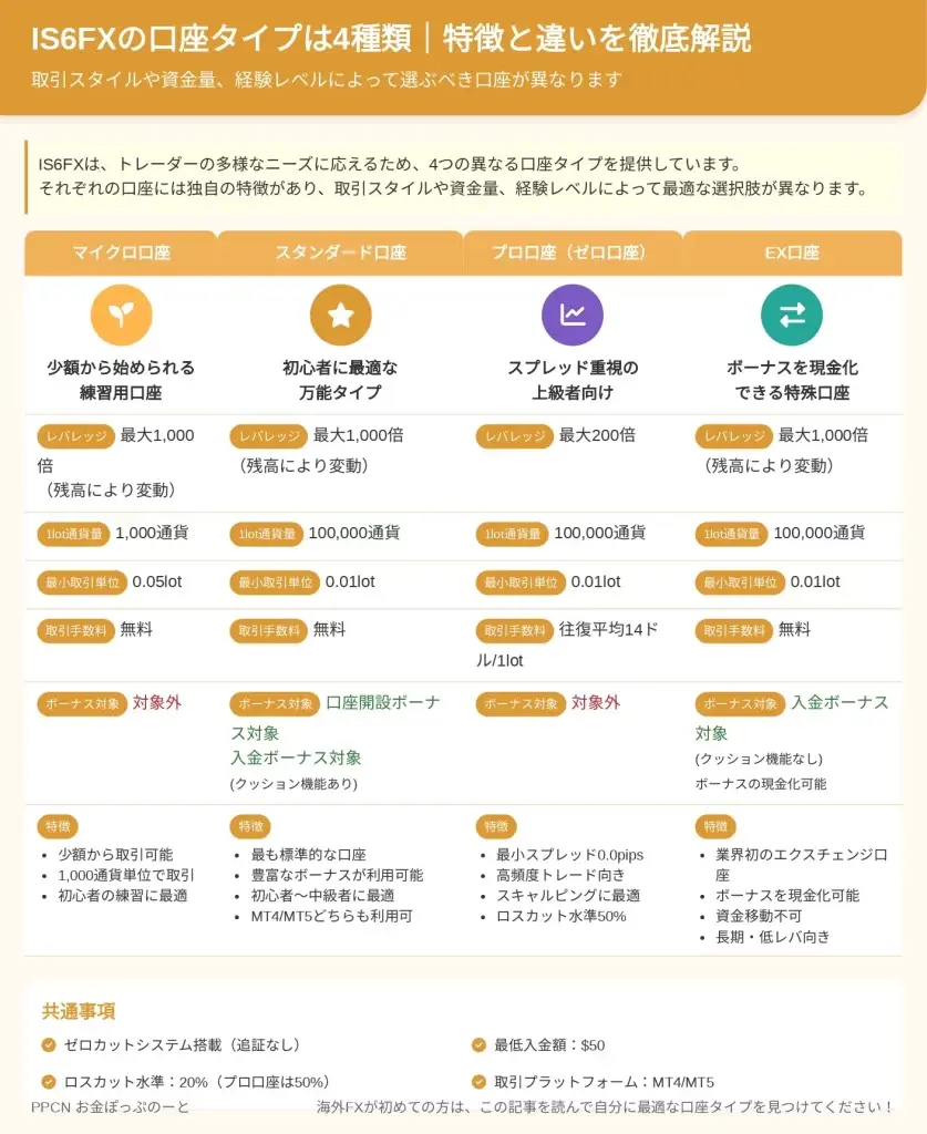この記事では、IS6FXの全4種類の口座タイプ(スタンダード・マイクロ・プロ・EX口座)の特徴とスペックを詳細比較表で解説します。