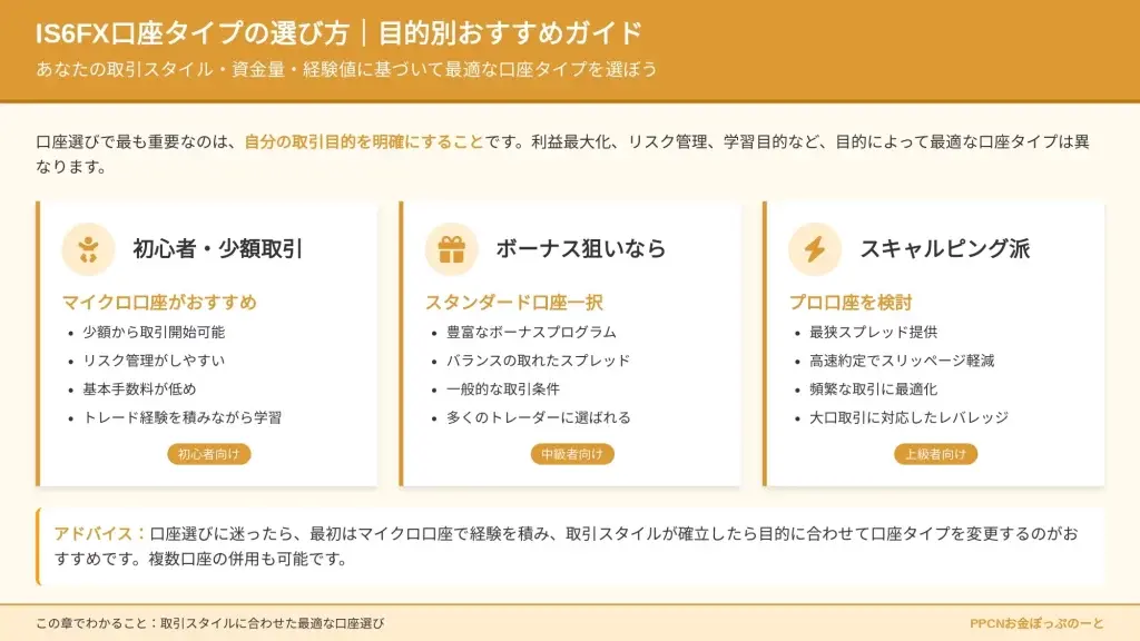 この記事で解説した内容を参考に、あなたに最適な口座タイプを選択し、IS6FXでの取引を成功させてください。