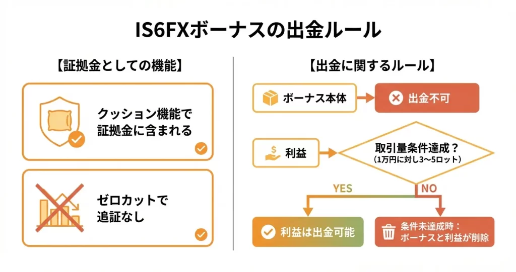 IS6FXのボーナスは証拠金として使えるが、出金には取引量条件があり、クッション機能で証拠金を保護する