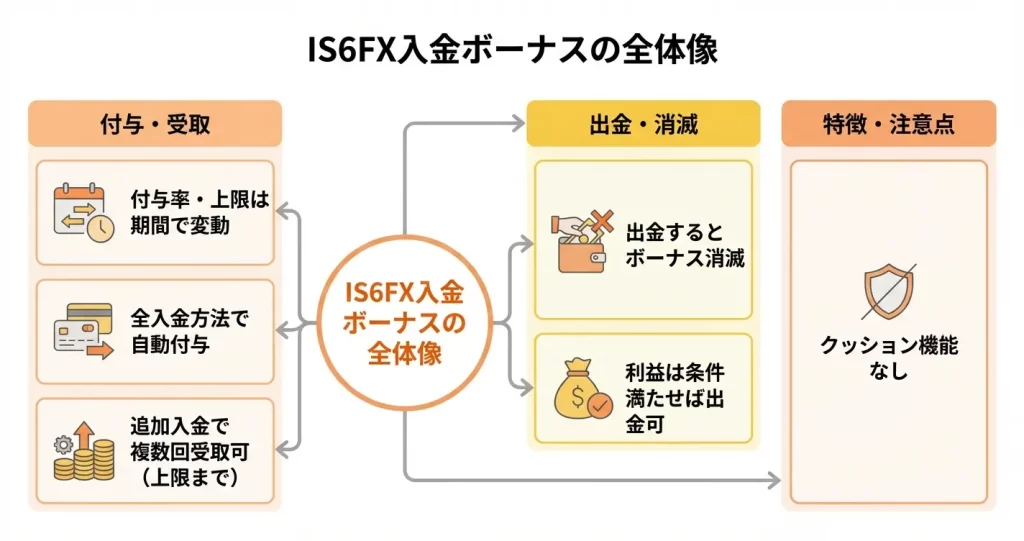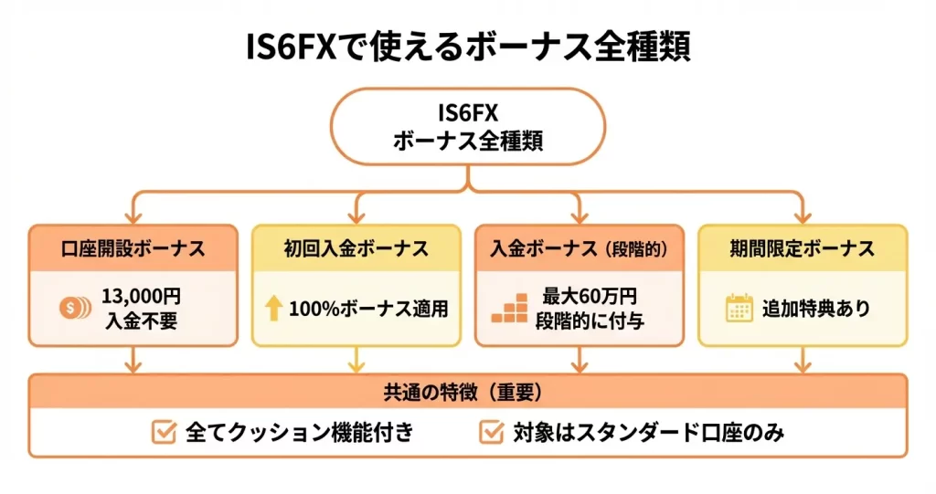 このセクションでは、IS6FXが実施中の主要なボーナスキャンペーンを種類別に整理し、それぞれの特徴と対象者を明示します。