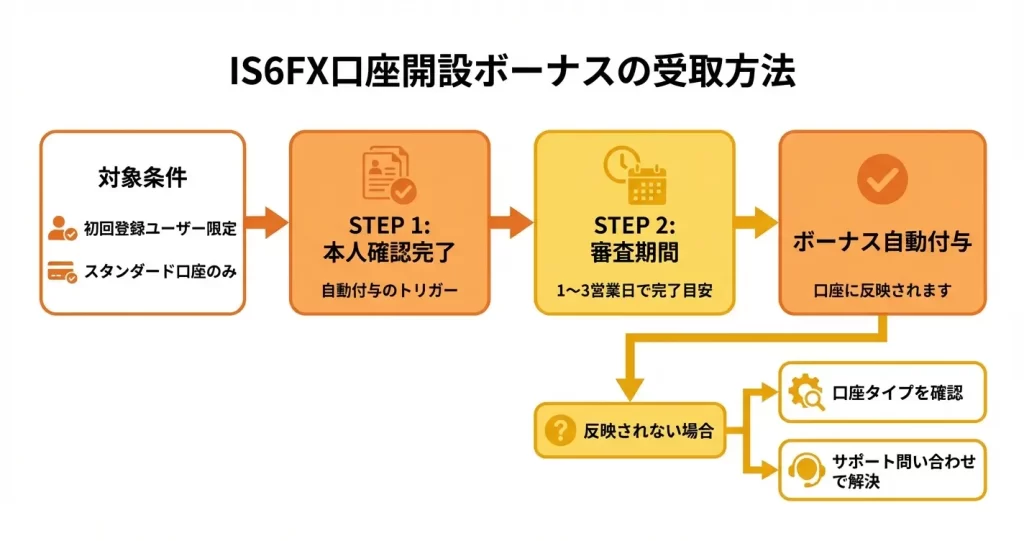 IS6FXの口座開設ボーナスは、新規口座開設時に自動付与される未入金ボーナスですが、対象となる口座タイプや受取手順を正しく理解していないと受け取れない場合があります。