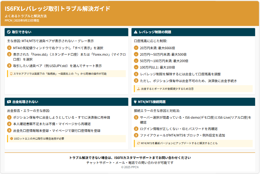 取引ができない、またはレバレッジが正しく反映されない問題は、IS6FXユーザーが最も頻繁に遭遇するトラブルの一つです。