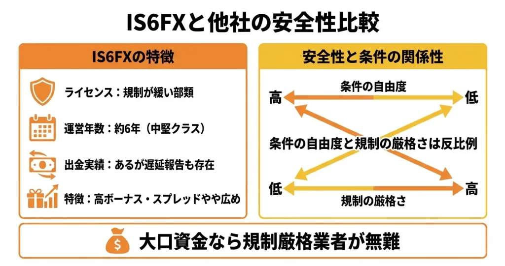 これらの業者は顧客資金の分別管理や定期的な財務報告が義務付けられており、IS6FXと比較して資金管理体制の透明性が高いとされています。