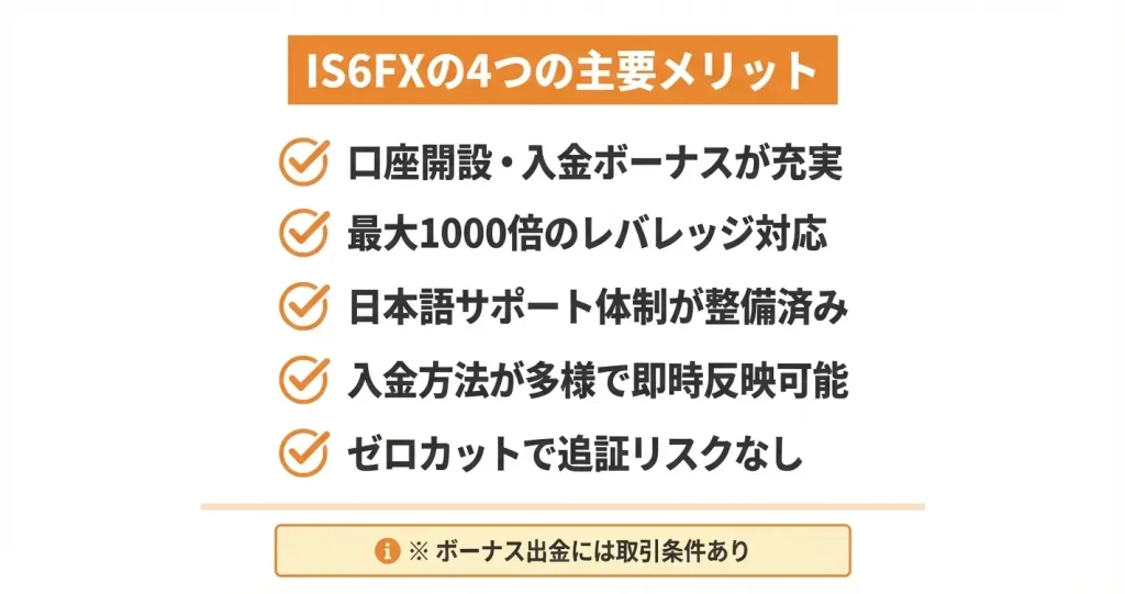 ここでは、口コミや利用実績から見えてくるIS6FXの主なメリットを、具体的な取引環境やサービス内容を通じて確認していきます。他の海外FX業者と比較した際の優位性についても整理します。
