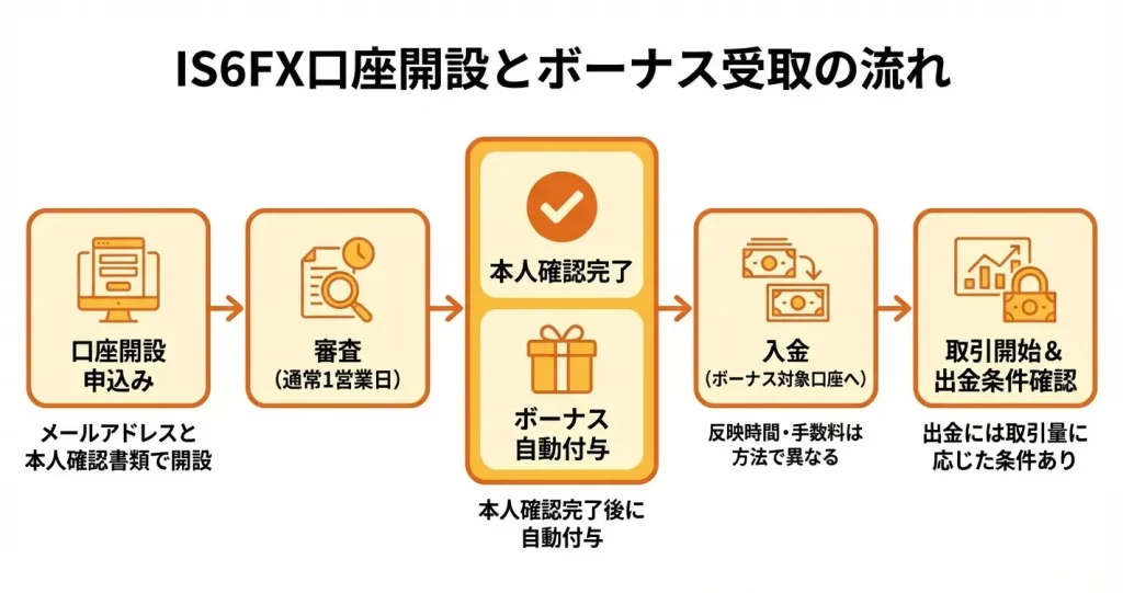 IS6FXで取引を始めるには、本人確認書類を用いた口座開設手続きと、ボーナス受け取り条件の確認が必要です。