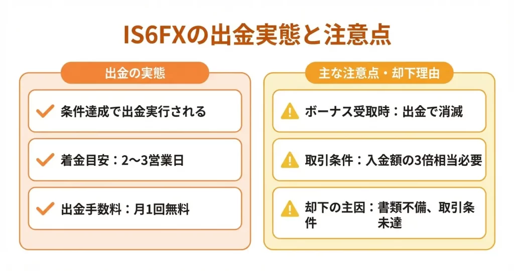 出金については、IS6FXでは本人確認と取引条件を満たしていれば通常数営業日以内に処理されるとされています。
