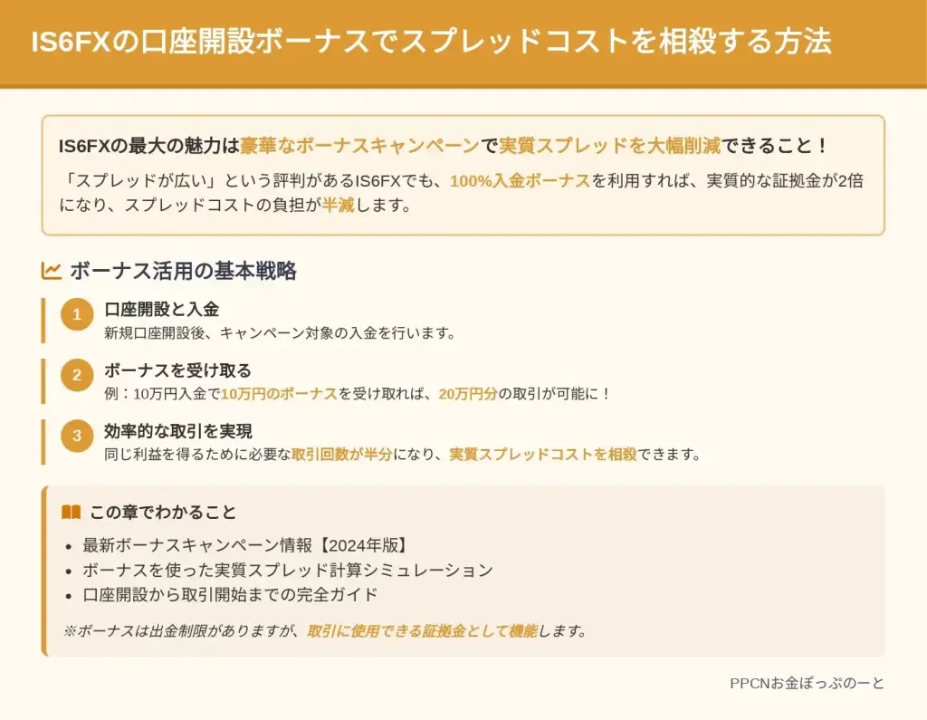 IS6FXのスプレッドは決して狭いとは言えませんが、適切な戦略とボーナス活用により、十分に競争力のある取引環境を実現できます。