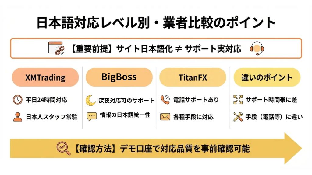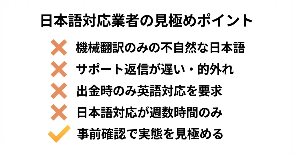 このため、日本語サポートの有無と対応範囲は、実質的なリスク軽減要素として機能します。