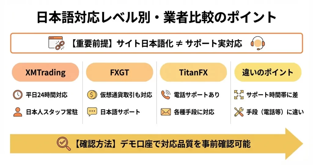 海外FX業者を選ぶ際、日本語サポートの有無や質は判断の重要なポイントになります。