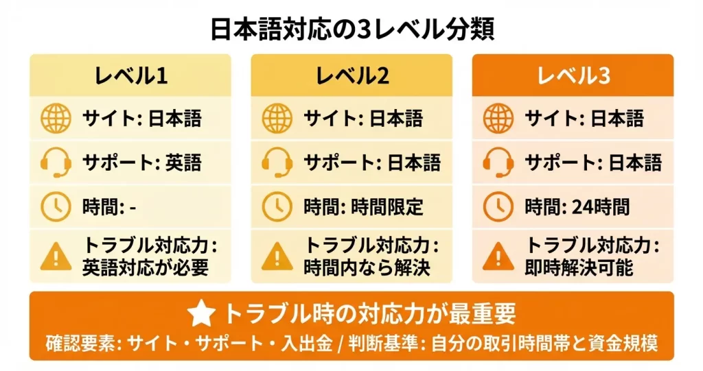 特に大きな資金を動かす場合や、専業トレーダーとして取引する場合には、レベル3の完全日本語対応を備えた業者を選ぶことが実務上のリスク管理として有効です。