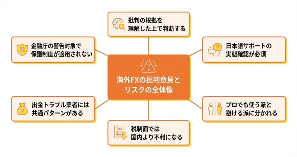 このセクションでは、海外FX業者に対する批判的な意見や実際のリスクを中立的に整理し、利用すべきかどうかを判断するための材料を提示します。