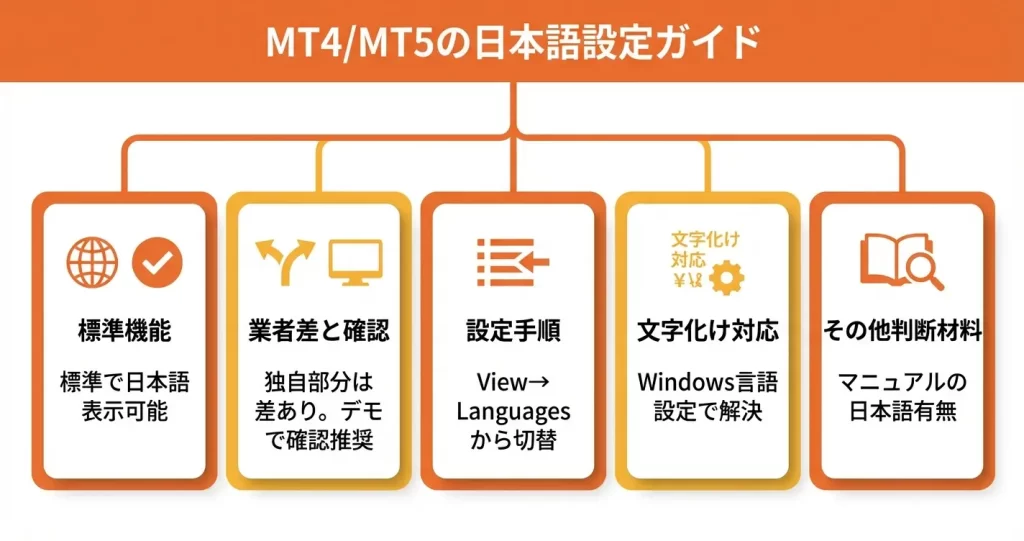 ここでは、表面的な情報だけで判断せず、実際に快適に利用できるかを見極めるための具体的な確認ポイントを5つに整理して解説します。口座開設前にこれらの項目を確認することで、言語面でのトラブルを未然に防ぐことができます。