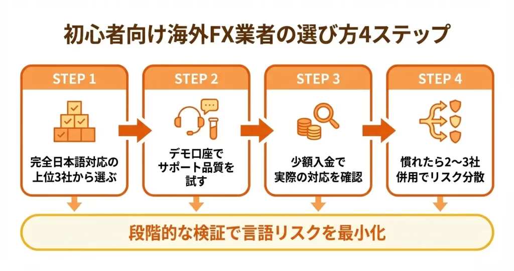 日本語対応の質を段階的に確認しながら業者を選定し、少額からリスクを抑えて運用を開始することで、初めての海外FX利用でも言語面の不安を最小化した環境を構築できます。