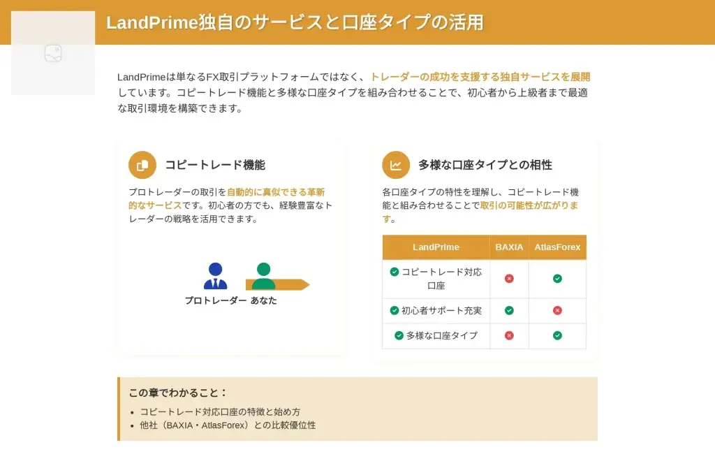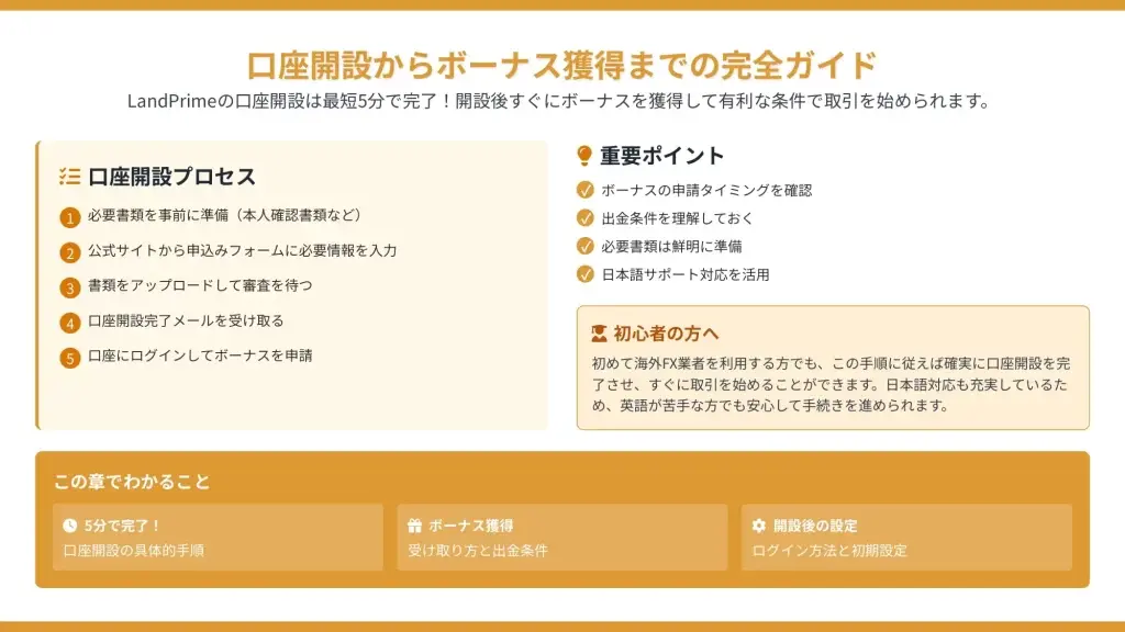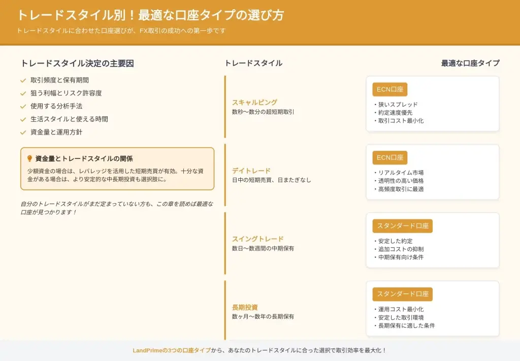 この記事を読めば、あなたのトレードスタイルと資金規模に最適なLandPrime口座タイプを自信を持って選択でき、お得なボーナスを活用しながら効率的に取引を開始できるようになります。