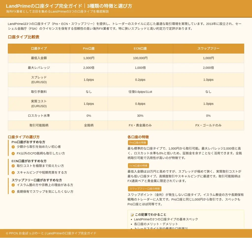 本記事では、LandPrimeの3つの口座タイプについて、それぞれの特徴やメリット・デメリットを詳しく解説し、読者の皆様が自分に最適な口座を選べるよう、包括的な情報を提供します。