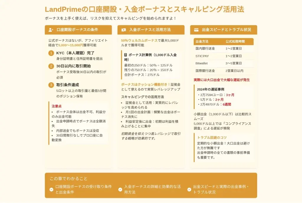 LandPrimeは技術的にはスキャルピングに適していますが、2024年以降の出金遅延問題は看過できません