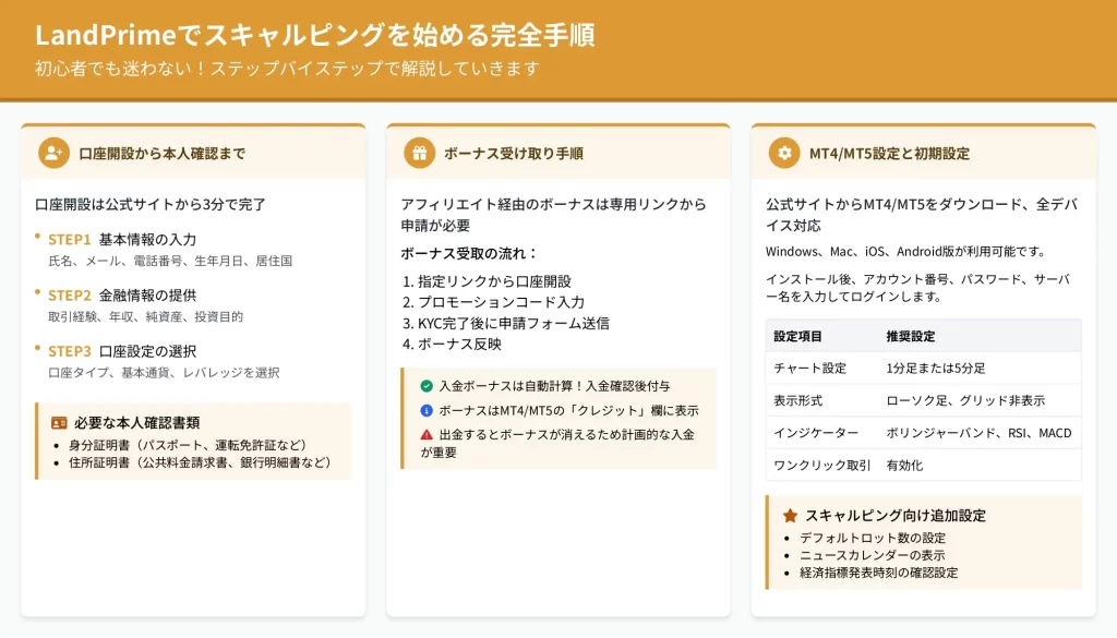 この記事を読めば、LandPrimeがあなたのスキャルピング取引に適しているかを正確に判断でき、もし始める場合は迷うことなく口座開設から実際の取引まで進められるようになります。初心者の方でも、ステップバイステップの解説により、安心してスキャルピング取引を始められるでしょう。