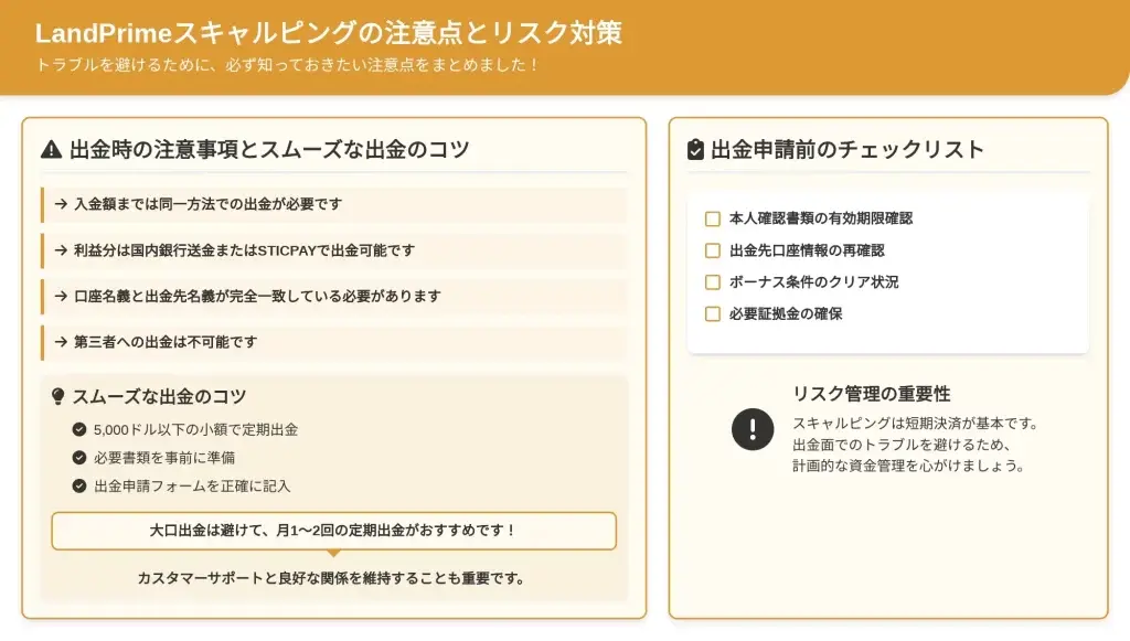 LandPrimeでスキャルピングを行う際は、特に出金面での注意が必要です。