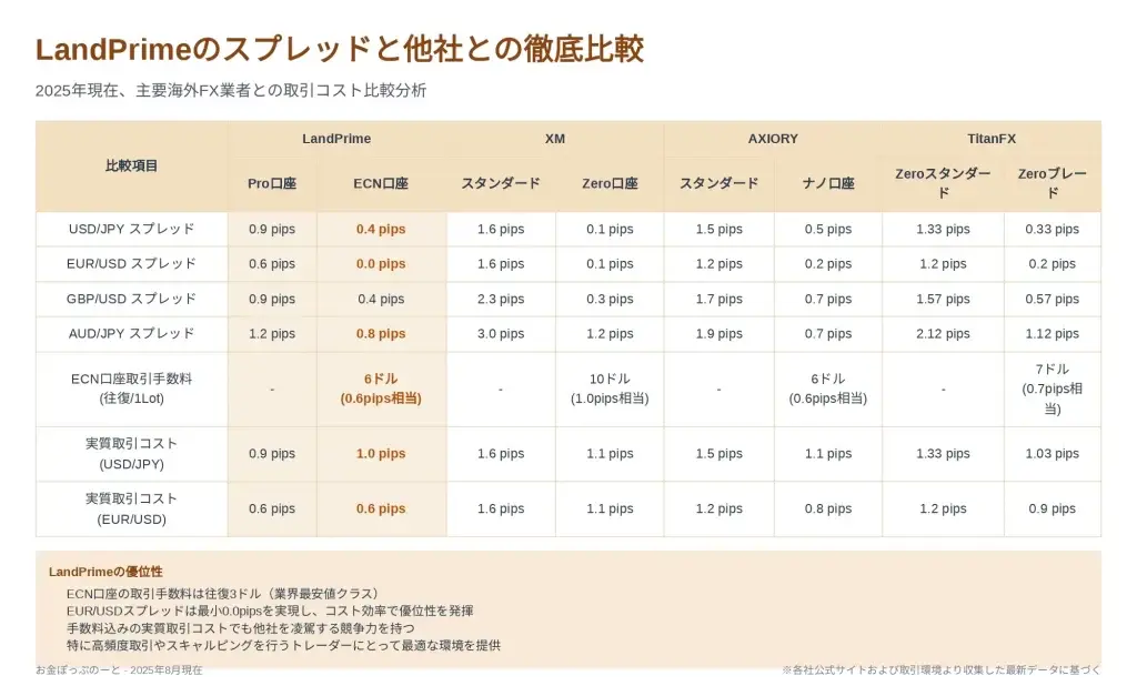 LandPrimeは2025年現在、主要海外FX業者の中でも特に競争力のある価格設定を実現しており、実質的な取引コストで見ると、多くの大手ブローカーを凌駕する水準となっています。