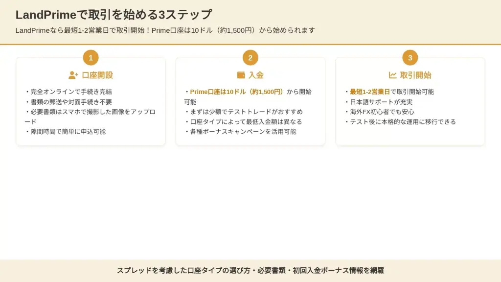 LandPrimeは、トレーダーの多様なニーズに対応するため、3つの主要な口座タイプを提供しています。