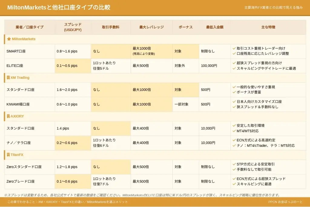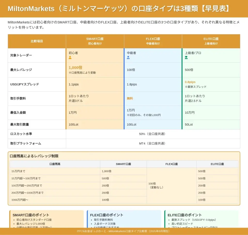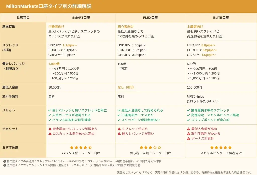 MiltonMarkets口座タイプ別スペック比較表