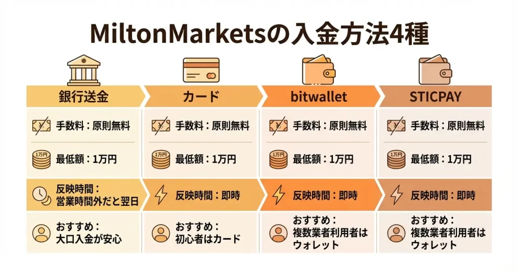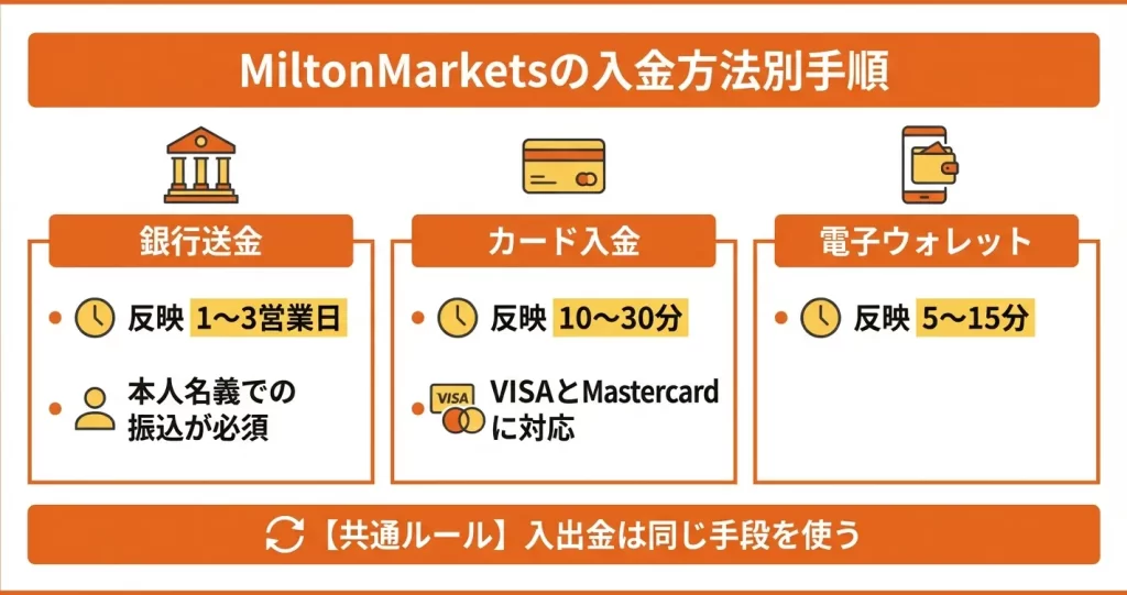 MiltonMarketsでは、複数の入金手段が用意されており、利用者の状況に応じて選択できます。