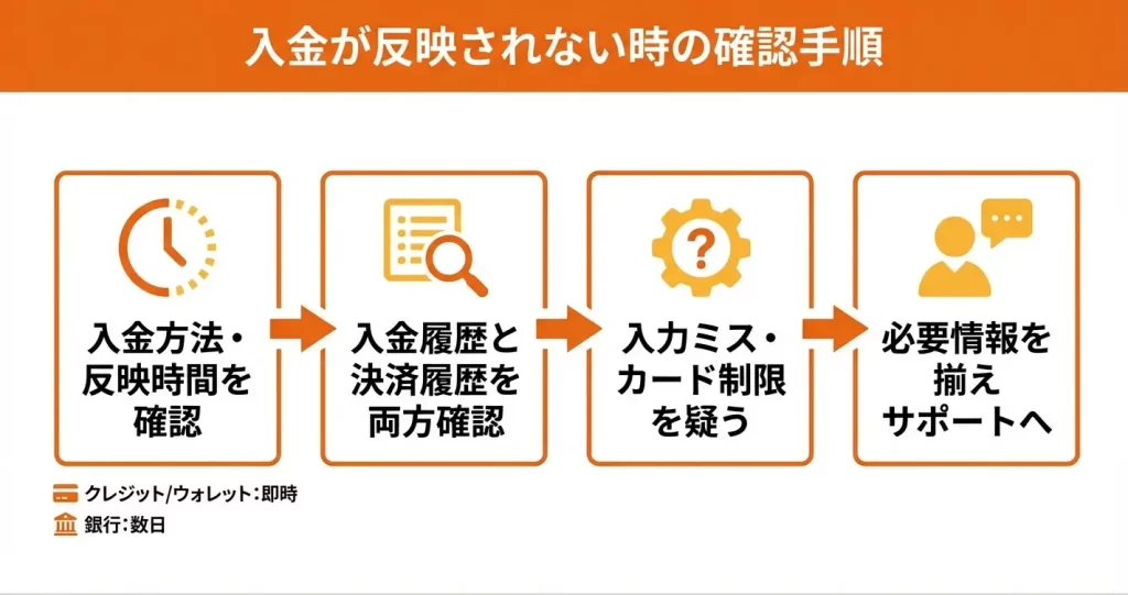 入金の反映には一定の時間を要するため、まずは処理時間と履歴を確認しましょう。