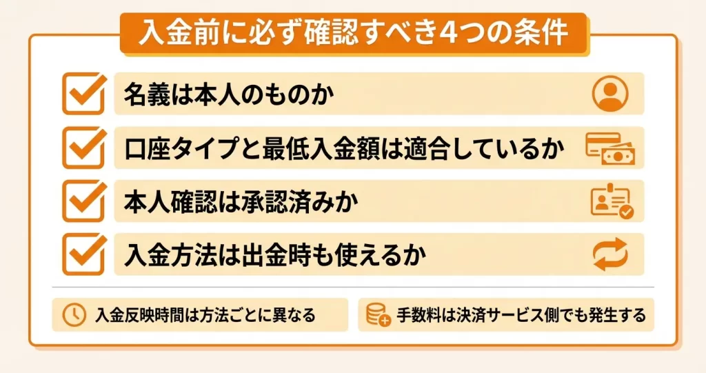 入金方法を選ぶ際は、反映速度、手数料負担、利用可能な環境の3つを軸に判断します。