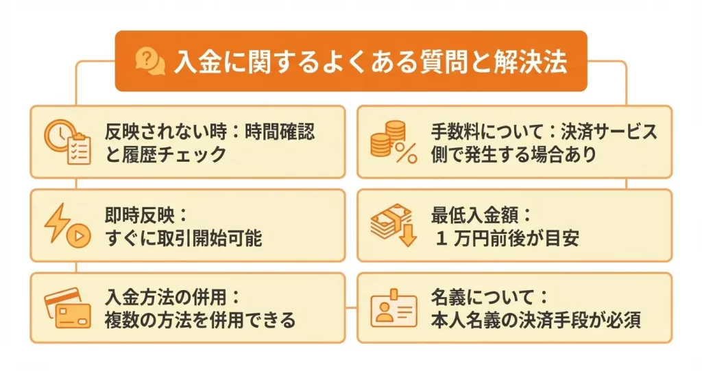 入金手続きを進める際の判断材料として活用してください。すでに本文で触れた内容も含め、実務上よくある疑問を中心に整理しています。