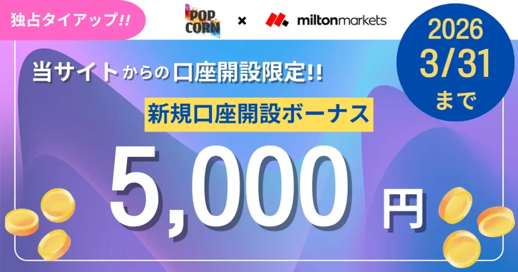 ミルトンマーケットでは、新規で口座を開設した方を対象に5,000円分の口座開設ボーナスが提供されています。