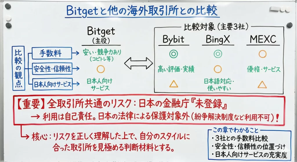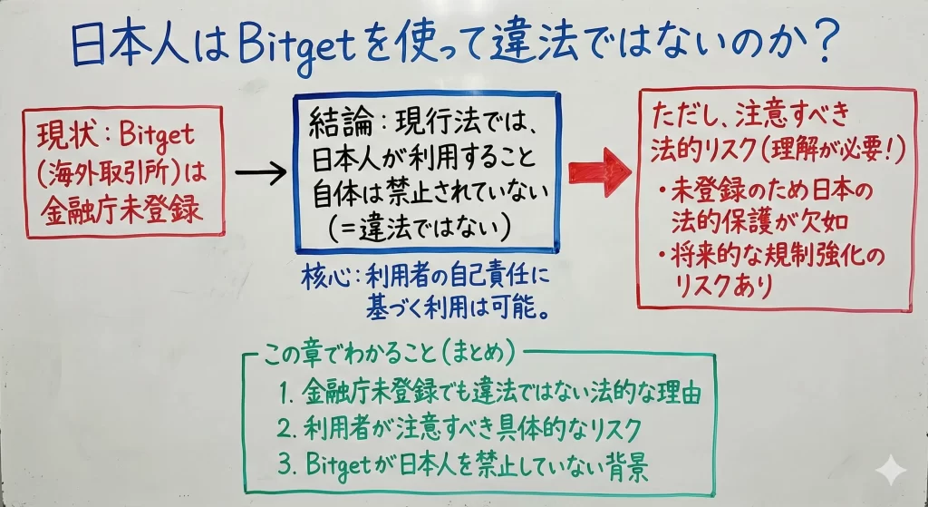 Bitgetは金融庁未登録の海外取引所ですが、日本の居住者が利用すること自体は現時点で違法ではありません。
