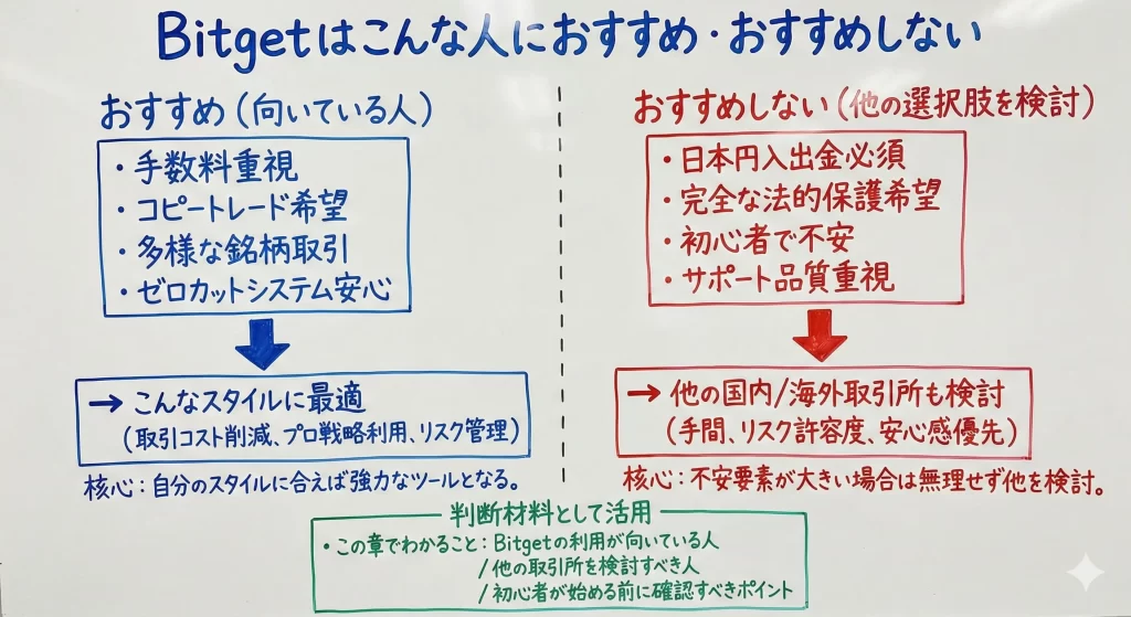 このセクションでは、これまでの情報を踏まえて、どのような人にBitgetが向いているのか、逆にどのような人は他の選択肢を検討すべきかを整理します。