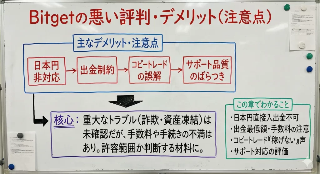 Bitgetには日本円非対応・出金制約・コピートレードの誤解・サポート品質のばらつきといった注意点があります